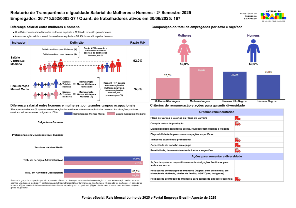 Nosso Relatório de Transparência e Igualdade Salarial é mais uma forma de demonstrar responsabilidade e respeito com nossos colaboradores e com a sociedade. Acreditamos que a construção de um ambiente de trabalho justo, diverso e inclusivo é essencial para garantir o desenvolvimento sustentável do nosso negócio.